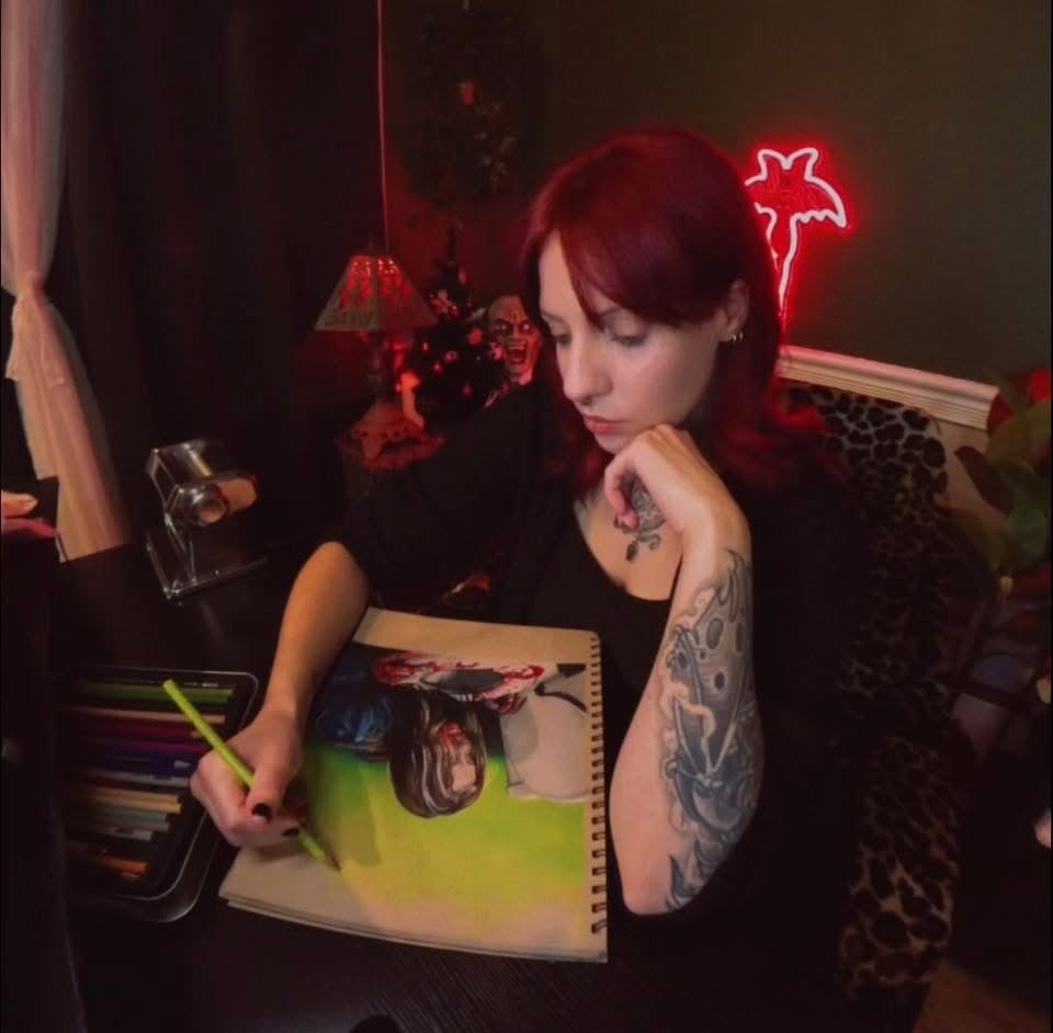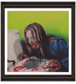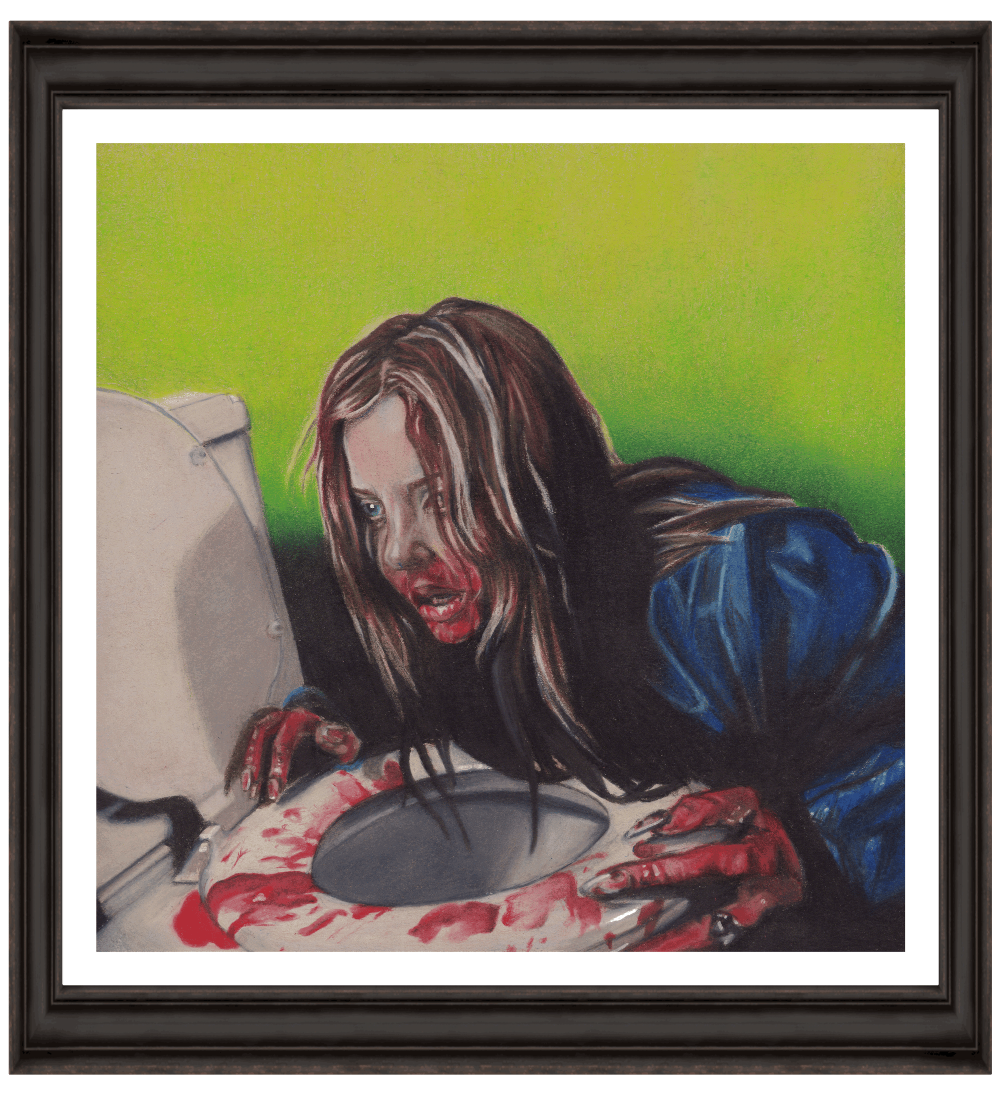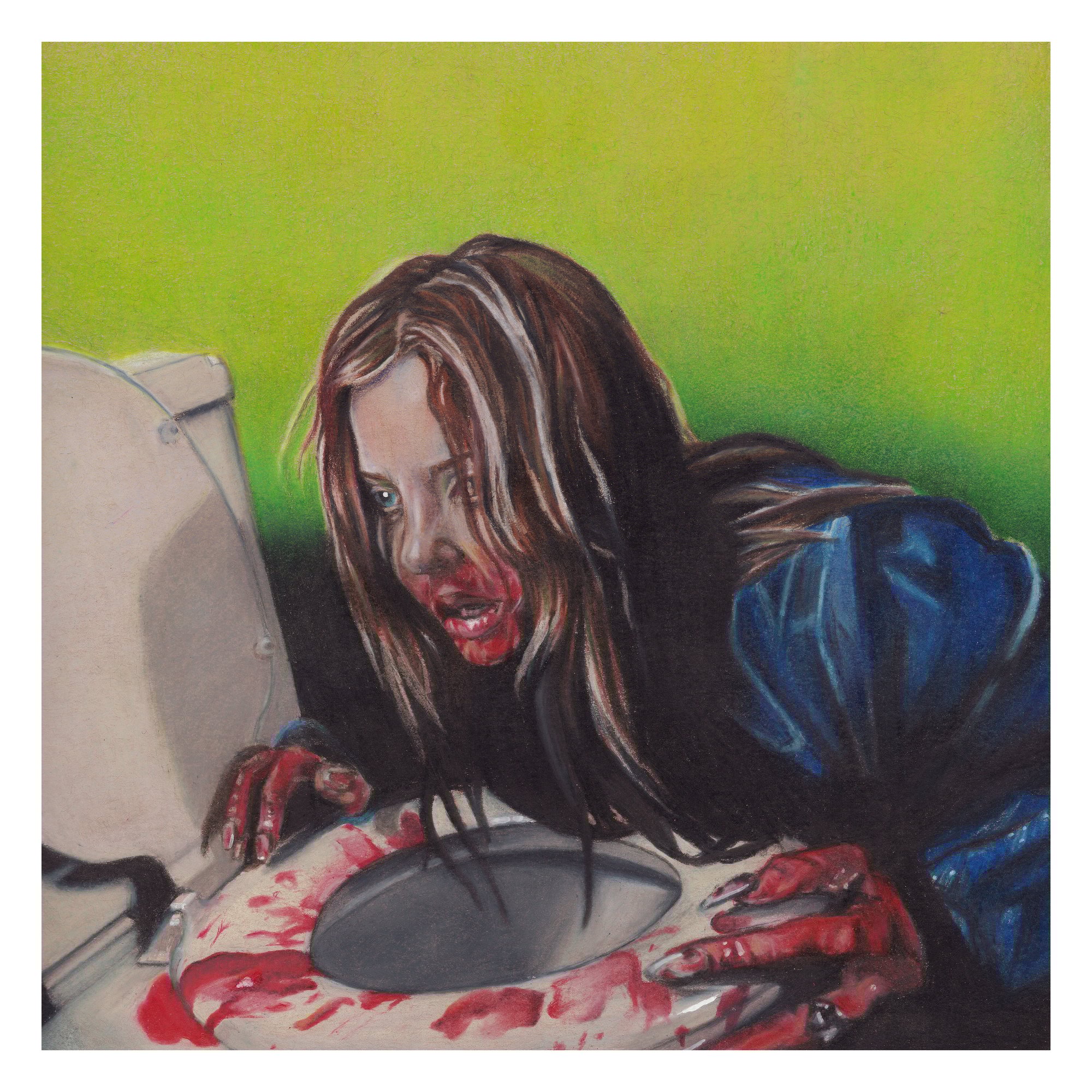 A figurative portrait defined by vivid color emerging from darkness. "Ginger Snaps" leans into horror and psychological tension rather than shying away from it.